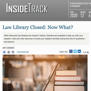 Amy Crowder, State Law Librarian, published an article in the April 1 issue of the State Bar of Wisconsin's InsideTrack. Law Libraries Closed: Now What? Learn about quick ways to get help while libraries are closed, and get an overview of legal research sources you can use from anywhere with your State Bar membership or a library card.