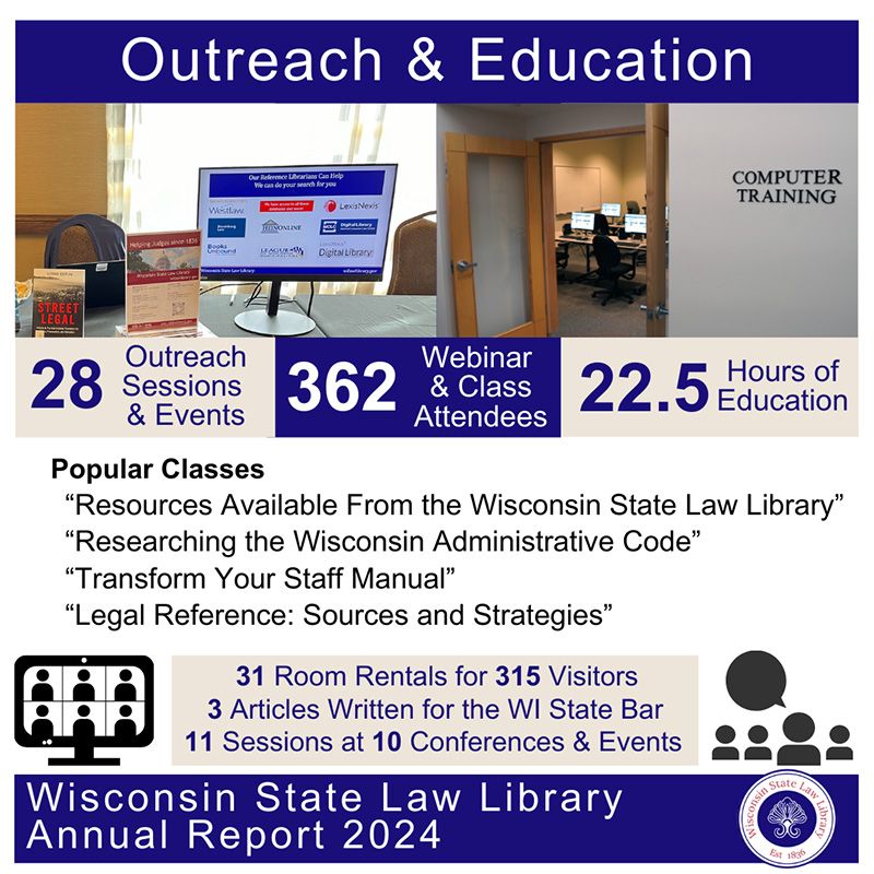 This month, we released our 2024 Annual Report. Over the past year, we have strengthened our commitment to serving people across Wisconsin through our outreach efforts, reference services, and expanded access to electronic resources. Our initiatives help government officials, attorneys, librarians, and state residents, regardless of location, have access to information they need about the law and the court system. We take pride in delivering expert research support, robust print and ebook collections, and providing court forms and legal information tailored to our diverse users' needs. Our library services continue to thrive in the state's two most populous counties, offering essential resources to pro se litigants and judges in the Dane and Milwaukee County courthouses.